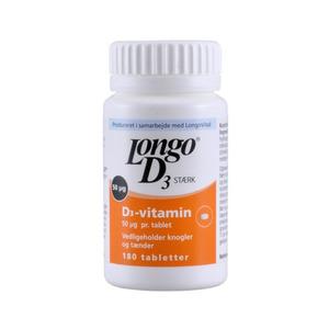 Longo D Stærk 50 mcg 180 tabletterDet kan være svært at få den daglige dosis af D-vitamin gennem kosten og solen. Longo D3 Stærk indeholder hele 50 mkg D3 vitamin. Longo D3 Stærk indeholder vitamin D som vedligeholder dit immunforsvar samt bidrager til no (Læs mere)